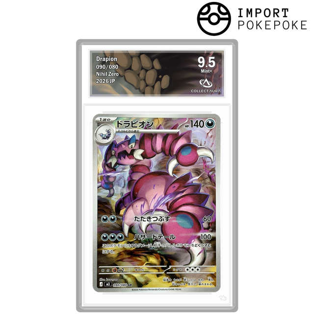 ID: 090/080. Type: Darkness. HP: 140. This 2026 piece is certified 9.5 Mint+ by Collect Aura, guaranteeing very high-level preservation for this strikingly graphic card.