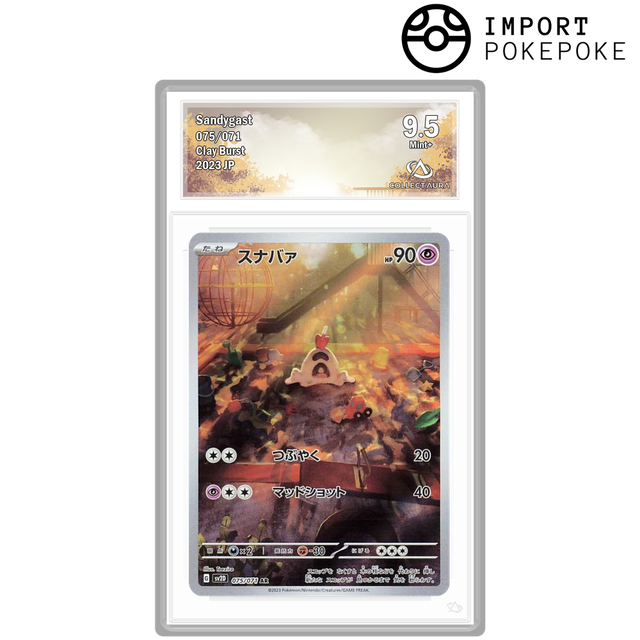 Le collectionneur des sables. Cette version Art Rare (AR) signée Teeziro fourmille de détails : lunettes, pelle et bijoux "emprisonnés" dans le Pokémon, le tout sublimé par le fini holographique japonais.