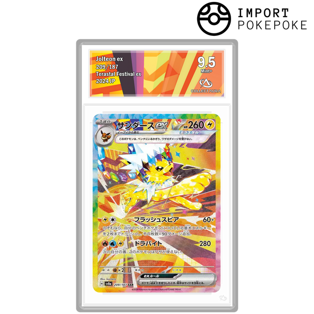 Une illustration "Special Art" électrisante mettant en scène Voltali dans un décor dynamique. La précision du trait et l'application des textures Téracristal sur ses épines capturent parfaitement l'énergie brute de ce Pokémon, le tout avec le fini premium des SAR japonaises.