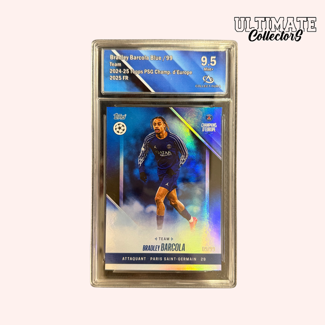 Une carte Topps dédiée à Bradley Barcola dans la collection Topps PSG Champions d’Europe 2025, numérotée /99 et en version gradée Collectaura pour une présentation premium. La numérotation /99 renforce l’attrait collection, et la gradation apporte surtout une dimension “valeur” : plus la note est élevée, plus la carte peut être recherchée et valorisée sur le marché collection.