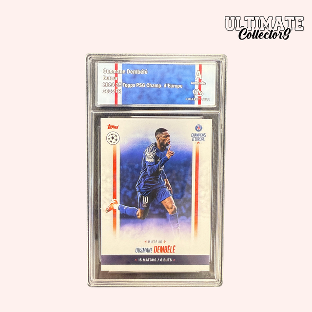 Une carte commémorative Topps dédiée à Ousmane Dembélé dans la collection Topps PSG Champions d’Europe 2025, en version gradée Collectaura pour une présentation premium. La gradation apporte surtout une dimension “valeur” : plus la note est élevée, plus la carte peut être recherchée et valorisée sur le marché collection.