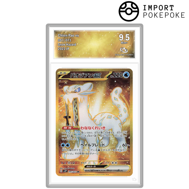 Atteignez les sommets de la rareté avec Baojian ex en version Ultra Rare (UR) Gold. Cette carte maîtresse de l'extension Snow Hazard (SV2p) présente le Pokémon légendaire dans une armure dorée étincelante