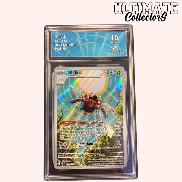 Vibrez à la vitesse du son avec cette magnifique carte Ninjask en version Illustration Rare (AR). Issue de l'extension Méga-Évolution, cette illustration pleine page capture l'agilité fulgurante du Pokémon dans un style graphique dynamique et détaillé