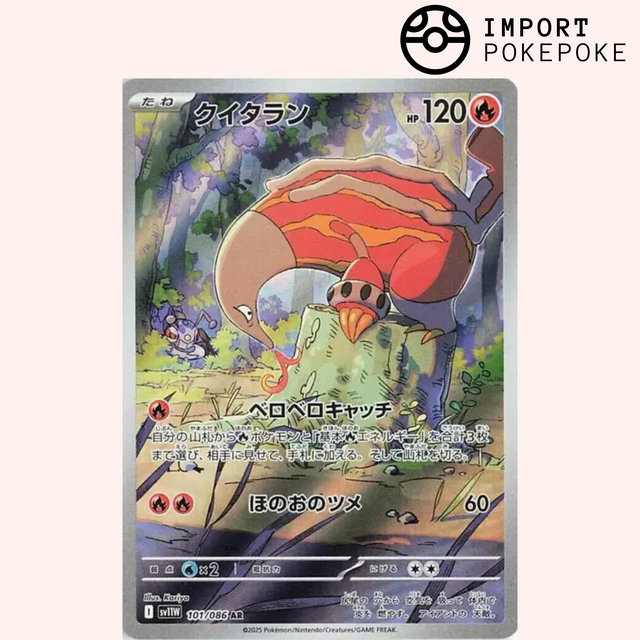 Voici la carte Art Rare d’Aflamanoir, issue de l’extension SV11w. L’illustration le montre en pleine forêt, perché sur une souche, utilisant sa longue langue pour attraper un Pokémon insecte. La scène met en avant son côté prédateur tout en conservant une ambiance naturelle et colorée.