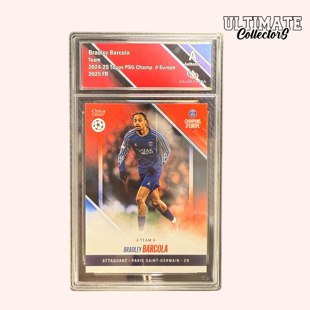 Une carte commémorative Topps dédiée à Bradley Barcola dans la collection Topps PSG Champions d’Europe 2025, en version gradée Collectaura pour une présentation premium. La gradation apporte surtout une dimension “valeur” : plus la note est élevée, plus la carte peut être recherchée et valorisée sur le marché collection.