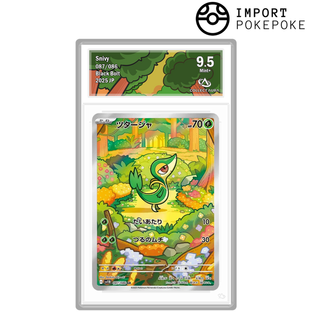 Miyoshi capture Vipélierre avec une précision remarquable, jouant sur le contraste entre le vert émeraude du Pokémon et les feuillages roux de l'arrière-plan.
