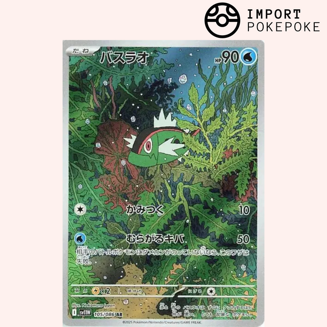 Voici la carte Art Rare de Gargantua (Basculin) issue de lâextension SV11w. Lâillustration nous plonge dans un dĂ©cor sous-marin foisonnant, oĂč Gargantua se faufile parmi les algues, surveillant son environnement avec son regard perçant.