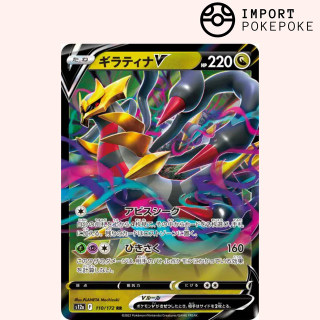 Provenant de la prestigieuse série japonaise S12a - VSTAR Universe, Giratina V apparaît dans une scène envoûtante, ses ailes noires et griffes écarlates se déployant dans un tourbillon de volutes violettes et émeraudes.