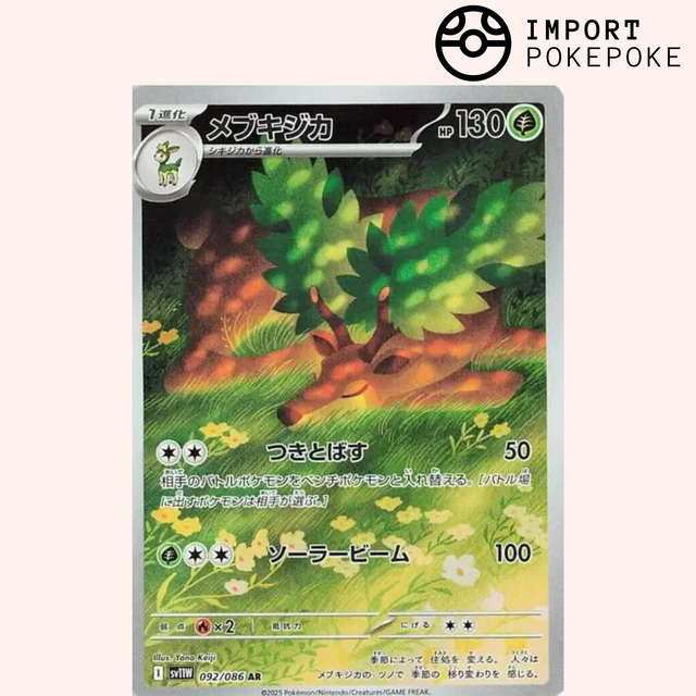 Sur cette carte Art Rare de la série SV11w, Haydaim repose dans une prairie fleurie. Son bois feuillu forme un abri végétal tandis que la lumière en taches dorées traverse les branches et tapisse son pelage.