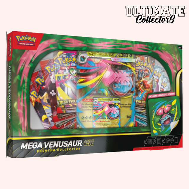 Un coffret premium centré sur Florizarre avec la carte Mega Florizarre-EX et un design néon inspiré de la ligne Mega Evolution. Parfait pour les collectionneurs de Kanto !