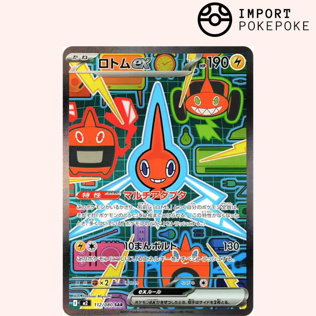 La carte Special Art Rare de Motisma ex (112/080) nous plonge dans un capharnaüm technologique plein de vie. Le petit Pokémon électrique virevolte au milieu d’un salon encombré d’objets électroniques : écrans, appareils électroménagers, gadgets en tout genre, tous illuminés par son énergie débordante.