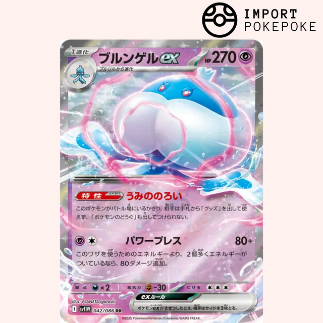 Sur cette carte japonaise de la sĂ©rie SV11w, Moyade ex flotte au-dessus dâune mer dĂ©chaĂźnĂ©e : son corps bleu perlĂ© est ceint dâun liserĂ© rose luminescent, tandis que des rubans dâĂ©cume et dâĂ©nergie psychique tourbillonnent autour de lui pour un effet holo tout en douceur.