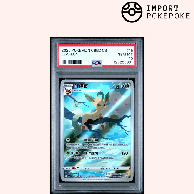 Cette Illustration Rare de Phyllali, issue de la série chinoise CBB2C (2025), met en valeur toute l’harmonie entre le Pokémon et la nature. L’illustration le montre perché sur une branche, entouré de feuillages et de pétales flottants, dans une scène paisible sublimée par des reflets holographiques arc-en-ciel.