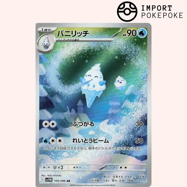 DĂ©couvrez la carte Art Rare de Sorboul, numĂ©ro 109/086, issue de lâextension SV11w. On y voit le petit cĂŽne glacĂ© lĂ©viter dans un paysage enneigĂ© : sapins stylisĂ©s, poudre de neige et halos polaires dessinent une scĂšne dâhiver fĂ©erique.